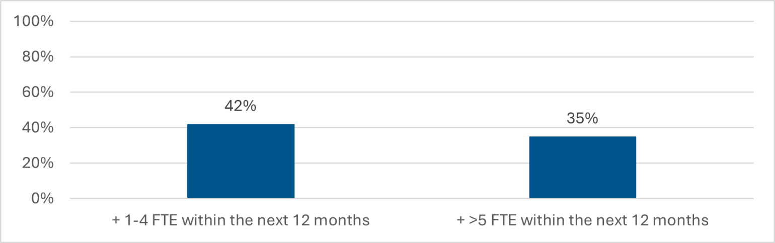 Over half of participating managers (55%) reported no current staffing shortages. Staff turnover varied, with 38% of managers experiencing 1 to 4 direct reports leaving in the past year and just over 1% reporting 5 to 10 departures. Most vacancies were filled from outside the organisation, with 70% of hires made through external recruitment.