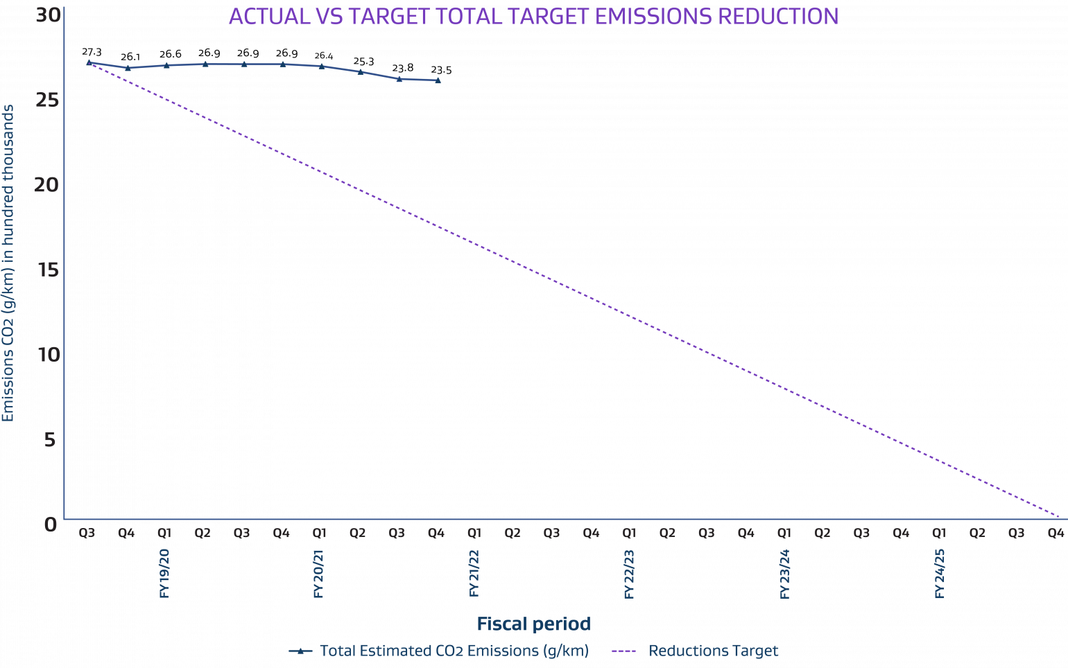 This graph represents the total estimated emissions profile of the government fleet, as of Quarter 4, 20/21. Emissions are measured in grams of CO2 per kilometre. The solid line is the government's total estimated CO2 emissions (g/km). The dash line represents the target reduction in emissions, taking into account the immediate 20 percent reduction that is required by agencies.